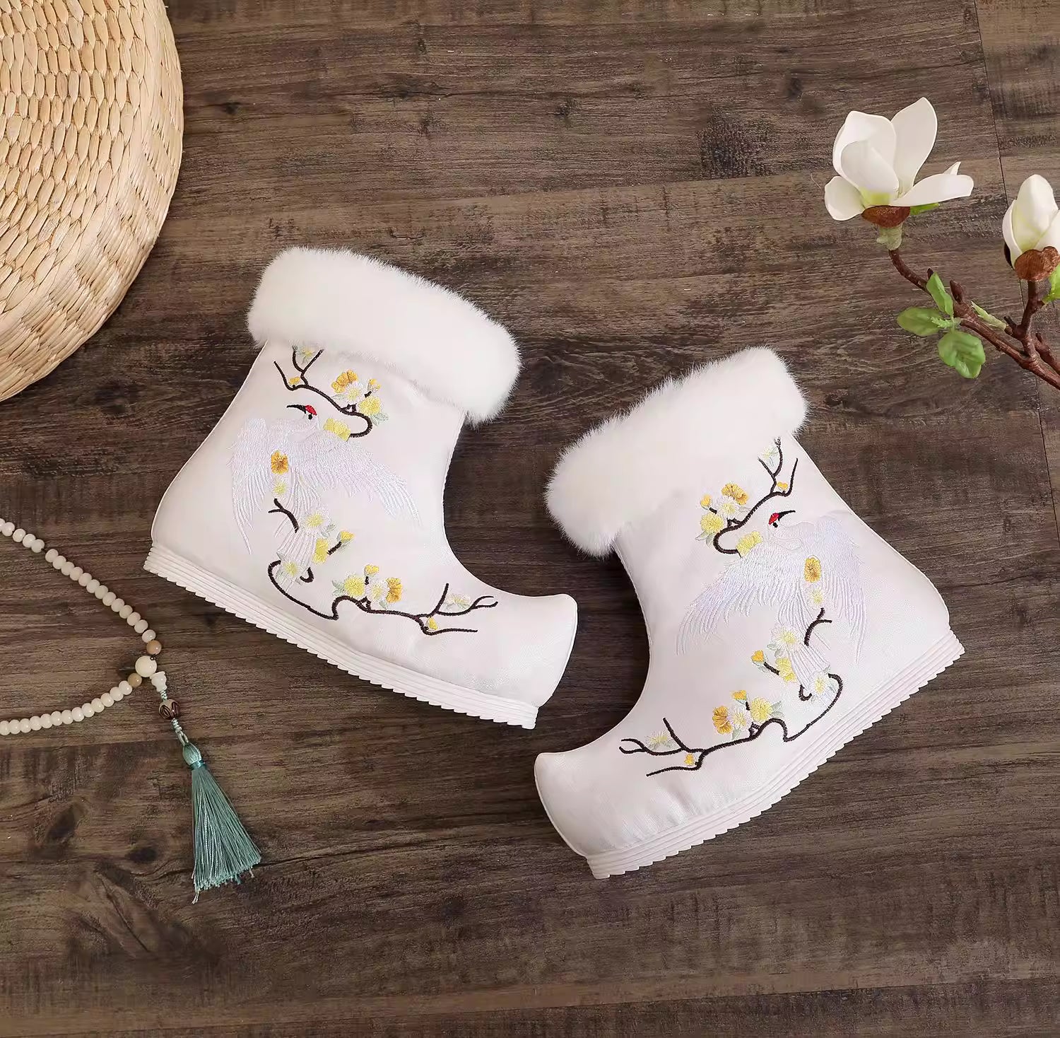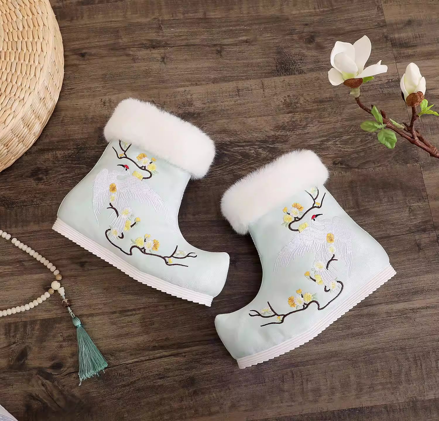 These women’s winter Hanfu boots feature an iconic up-turned toe design and fleece-lined cotton construction for warmth. As a modern take on traditional black Hanfu boots, they come with a hidden elevated sole and exquisite Chinese-style embroidery, making them the ideal match for horse-face skirts and other ancient-style outfits.