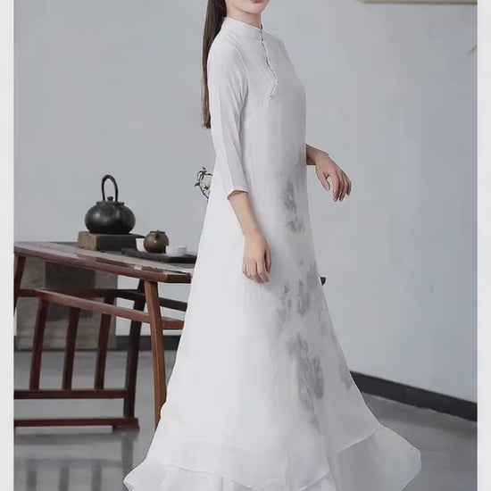 Crafted from smooth luxurious silk, it boasts a delicate and warm touch, with a flowing drape as you move. The vintage ink wash painting printed on the garment features distant mountains and near rivers, full of oriental artistic conception. The minimalist cross-collar exudes gentleness and sophistication, adorned with traditional Chinese frog buttons for subtle detail, and the natural falling hem outlines an elegant silhouette.