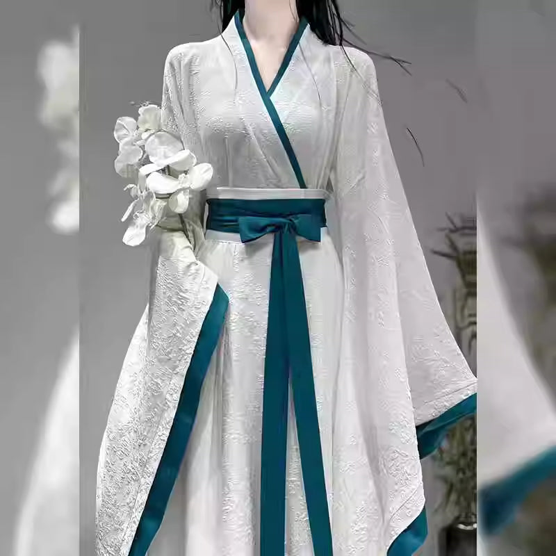 Women's Autumn Hanfu with Cross-collar, Wide Sleeves and Waist-length Jacquard Skirt in Wei-Jin-Southern-Northern Dynasties & Warring States Style。
